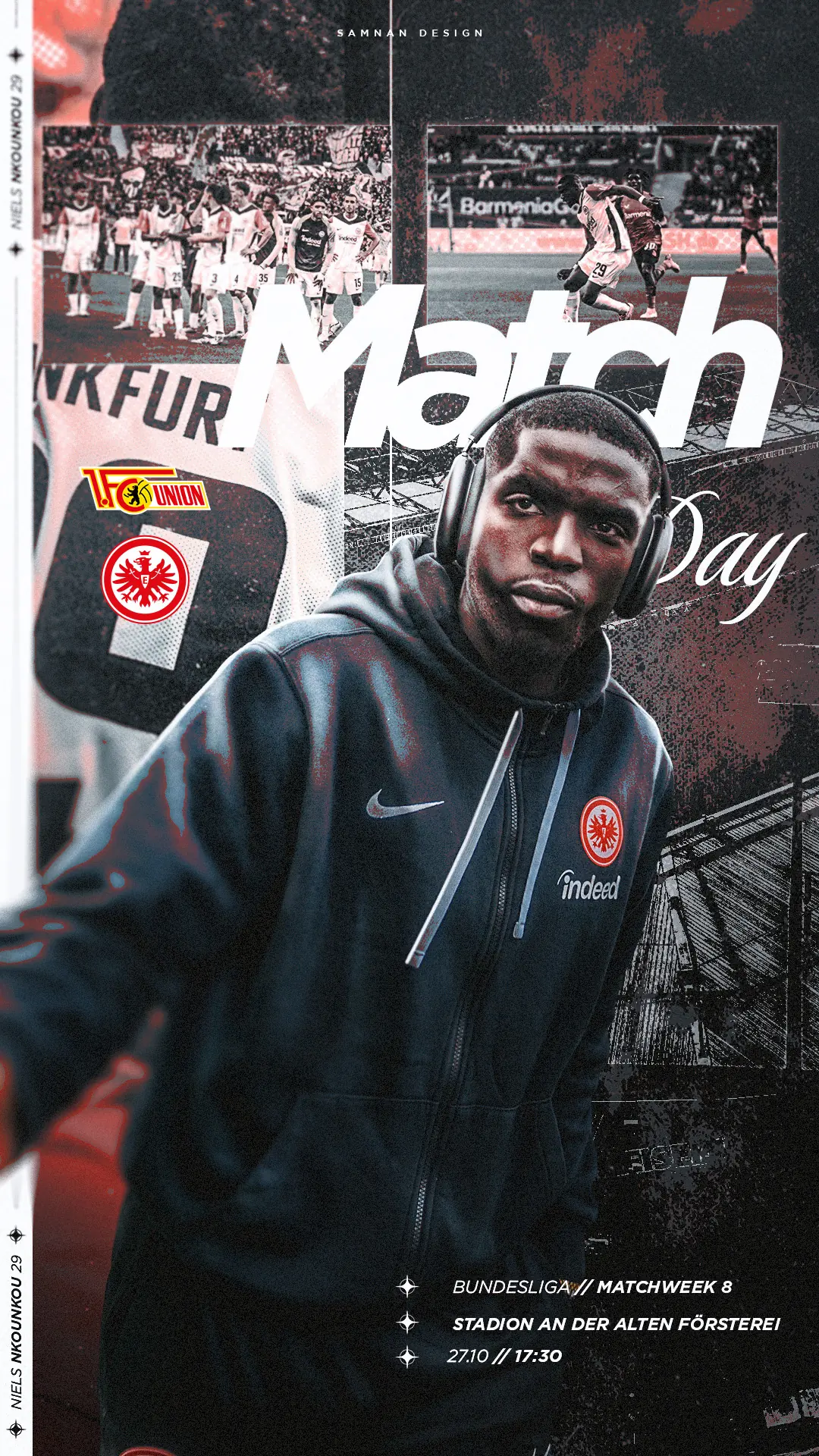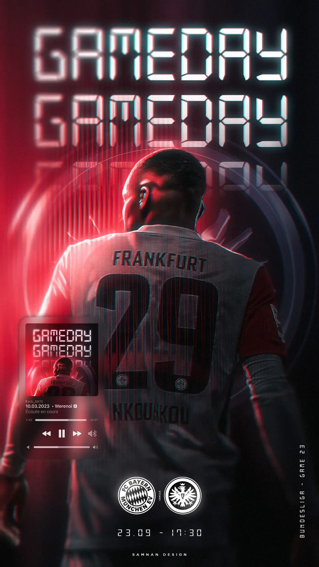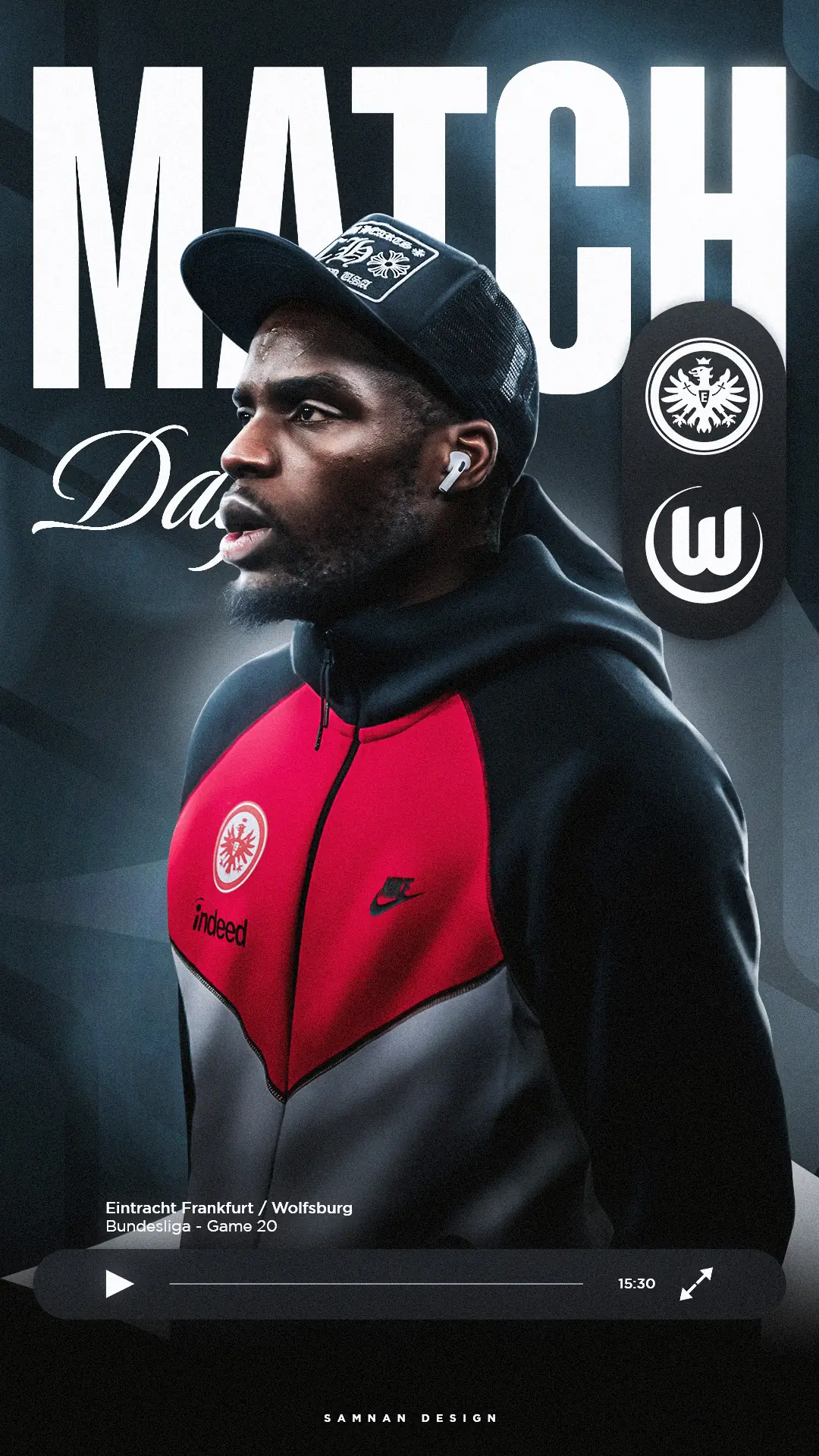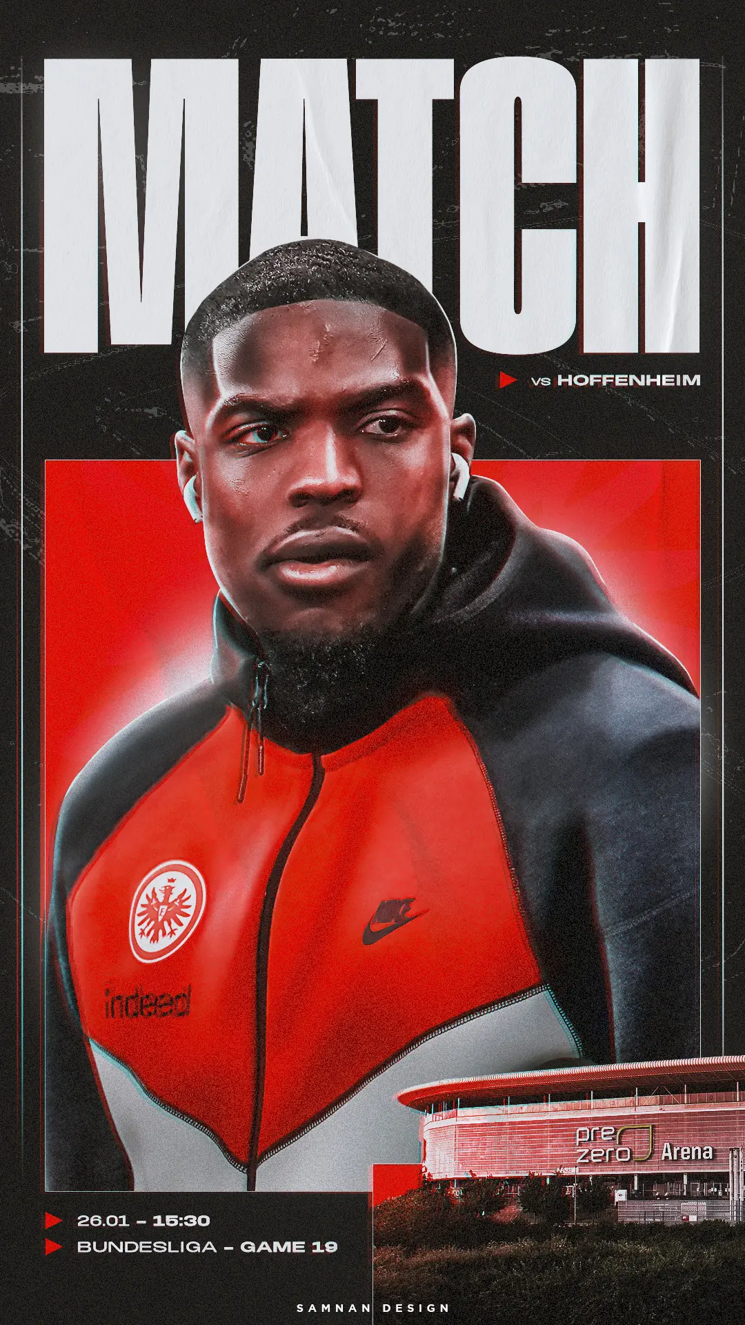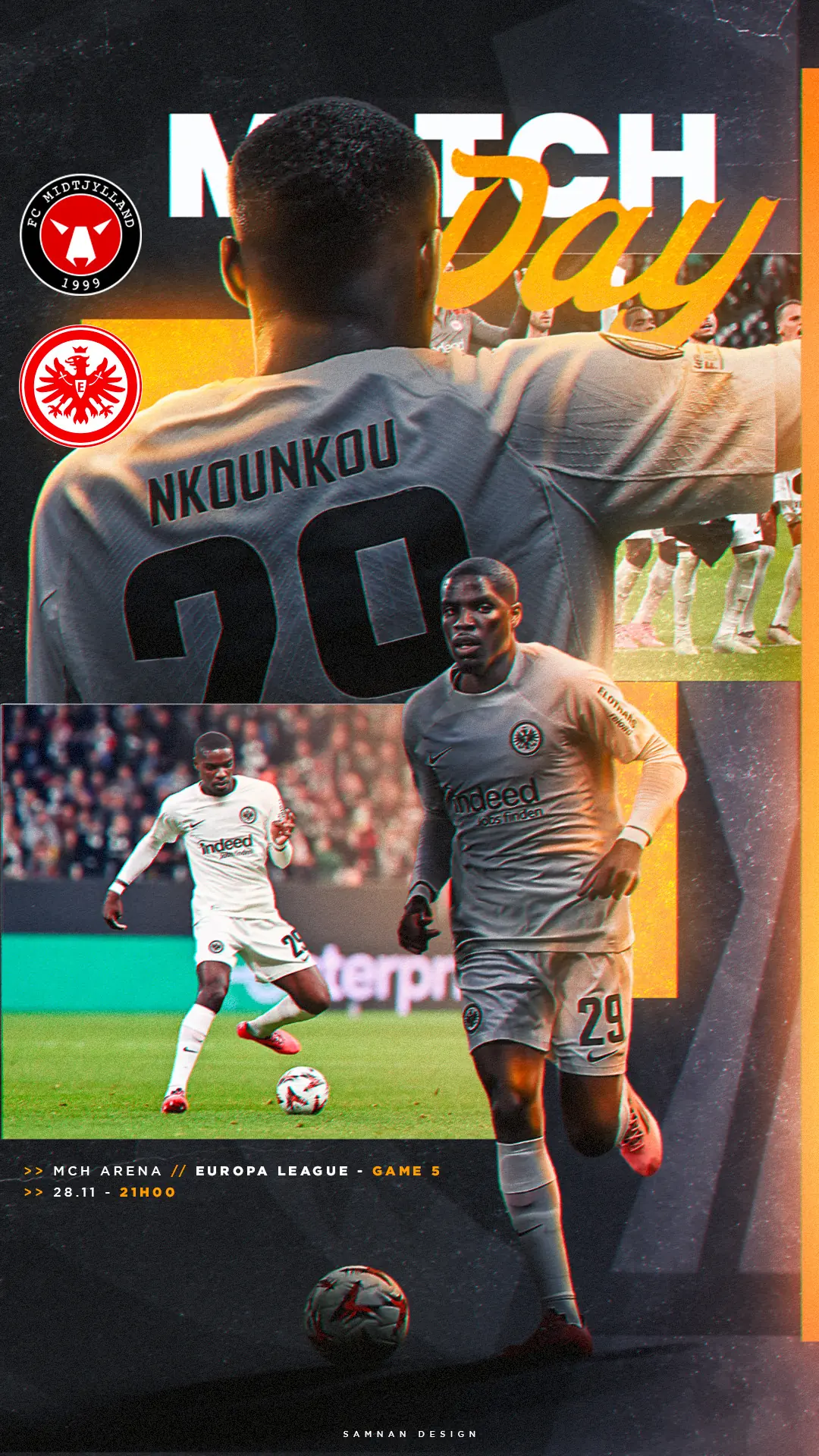 Niels Nkounkou est un joueur français qui évolue actuellement dans le club de l’Eintracht Francfort. L’Agence Double Contact m’a fait part de son envie et besoin d’avoir des visuels d’avant-match. Les visuels d’avant-match jouent un rôle clé dans la communication autour d’un match. Ils permettent d’informer les supporters sur les détails du match, de promouvoir la rencontre sur les réseaux sociaux et de mettre en valeur le joueur sur les réseaux sociaux. Ils permettent aussi de renforcer l’identité du joueur, créer de l’attente chez les fans, et donc génère des interactions et une proximité avec les fans.