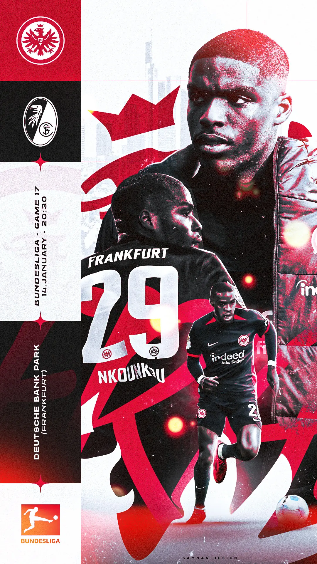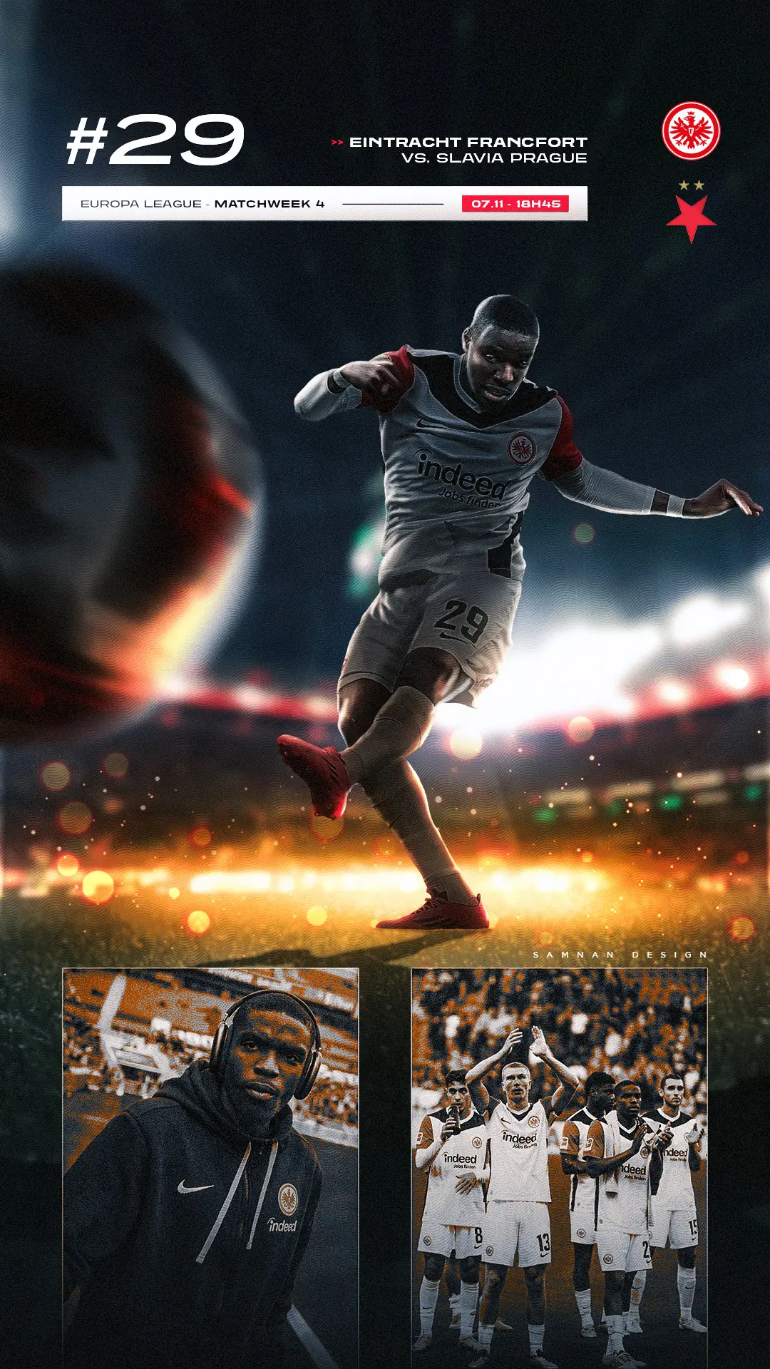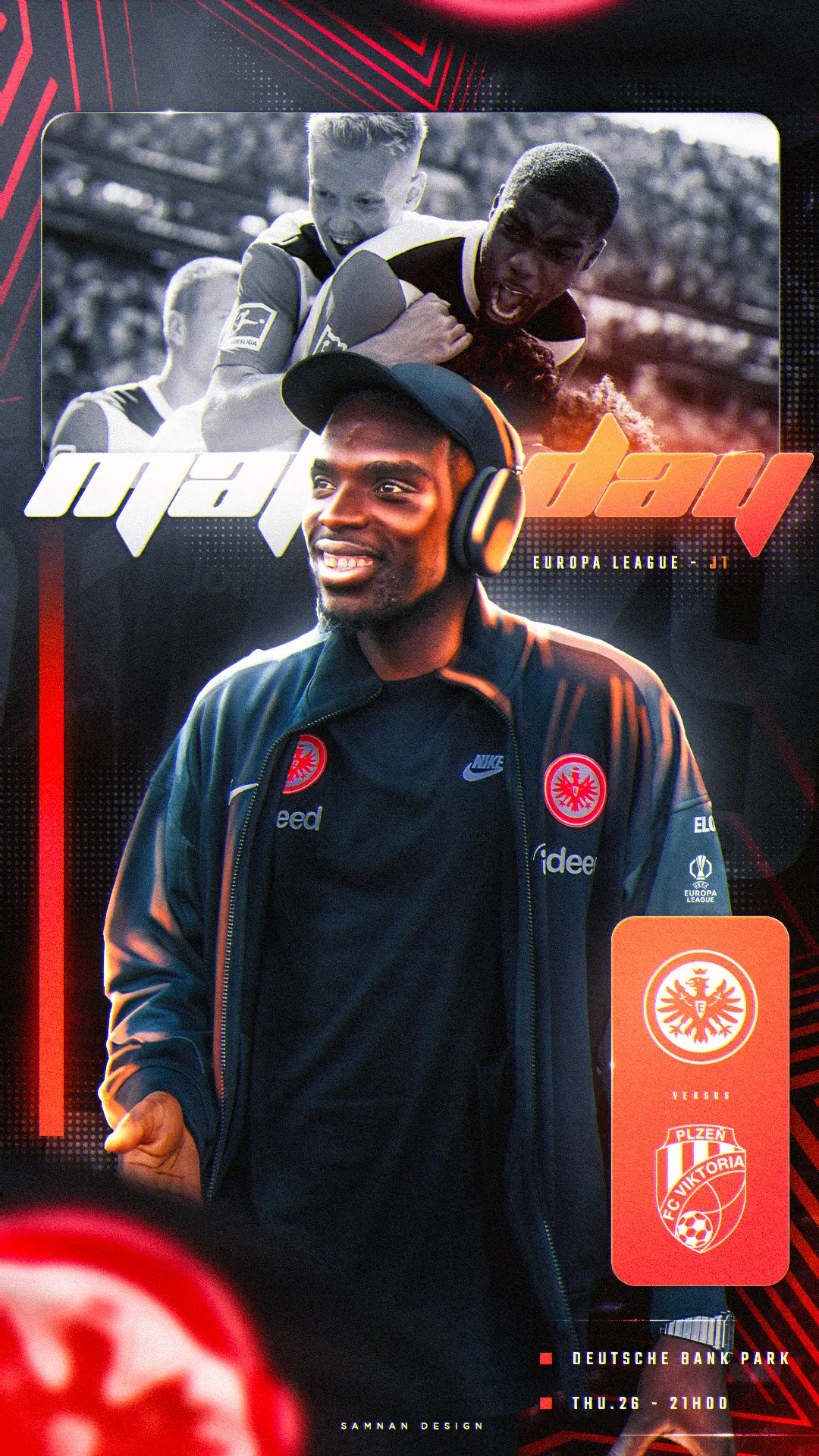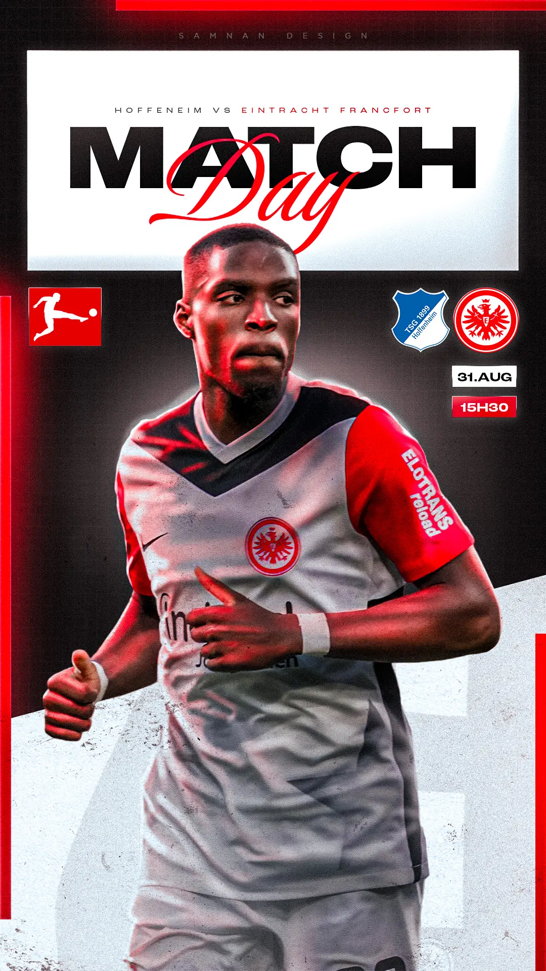 Niels Nkounkou est un joueur français qui évolue actuellement dans le club de l’Eintracht Francfort. L’Agence Double Contact m’a fait part de son envie et besoin d’avoir des visuels d’avant-match. Les visuels d’avant-match jouent un rôle clé dans la communication autour d’un match. Ils permettent d’informer les supporters sur les détails du match, de promouvoir la rencontre sur les réseaux sociaux et de mettre en valeur le joueur sur les réseaux sociaux. Ils permettent aussi de renforcer l’identité du joueur, créer de l’attente chez les fans, et donc génère des interactions et une proximité avec les fans.
