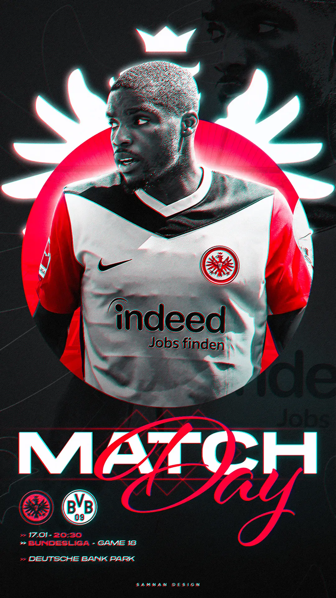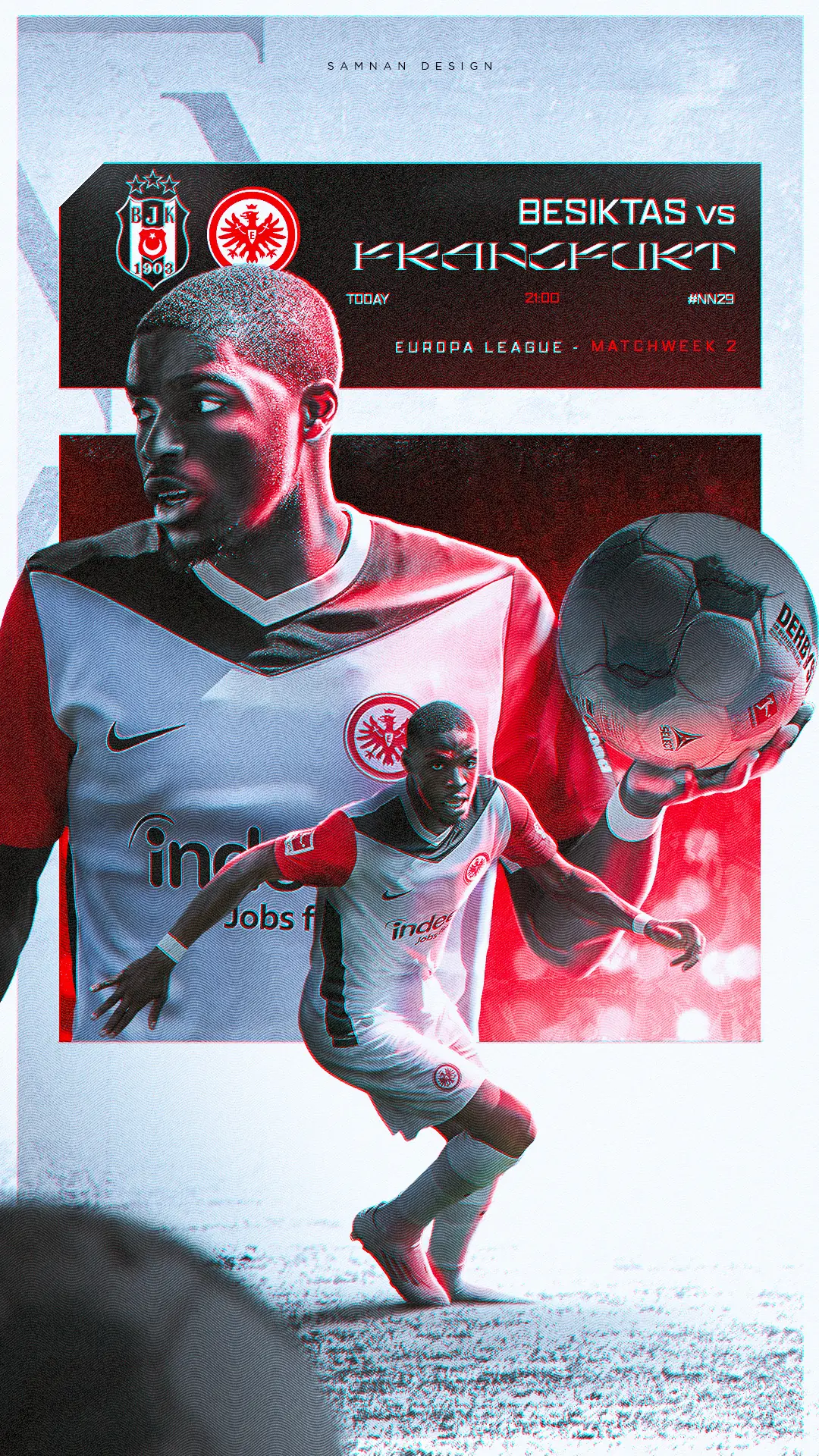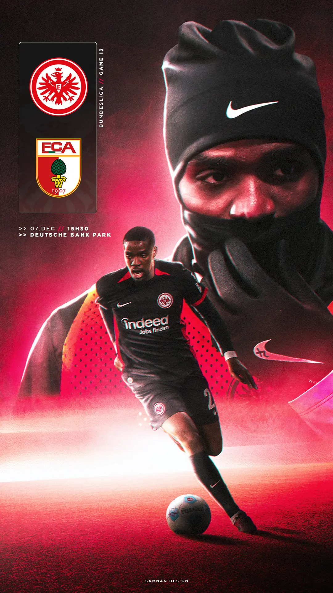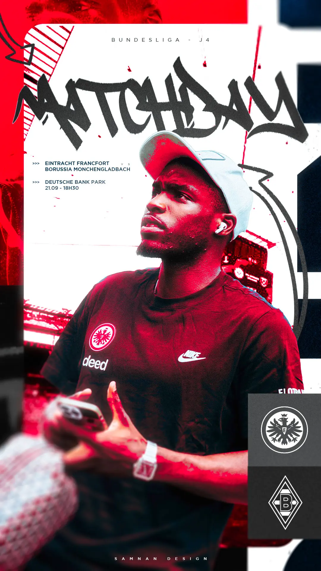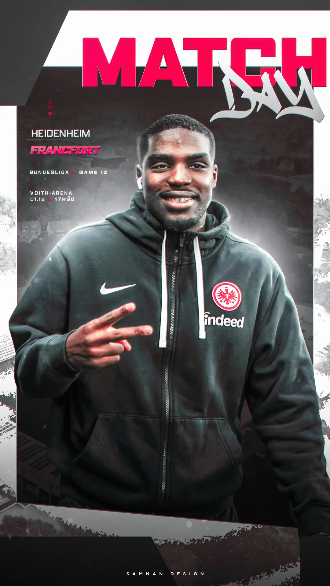 Niels Nkounkou est un joueur français qui évolue actuellement dans le club de l’Eintracht Francfort. L’Agence Double Contact m’a fait part de son envie et besoin d’avoir des visuels d’avant-match. Les visuels d’avant-match jouent un rôle clé dans la communication autour d’un match. Ils permettent d’informer les supporters sur les détails du match, de promouvoir la rencontre sur les réseaux sociaux et de mettre en valeur le joueur sur les réseaux sociaux. Ils permettent aussi de renforcer l’identité du joueur, créer de l’attente chez les fans, et donc génère des interactions et une proximité avec les fans.