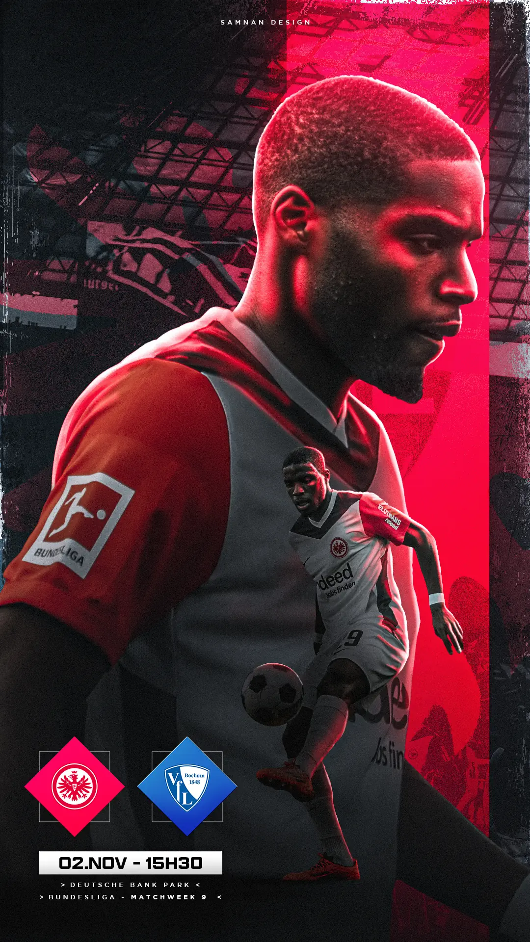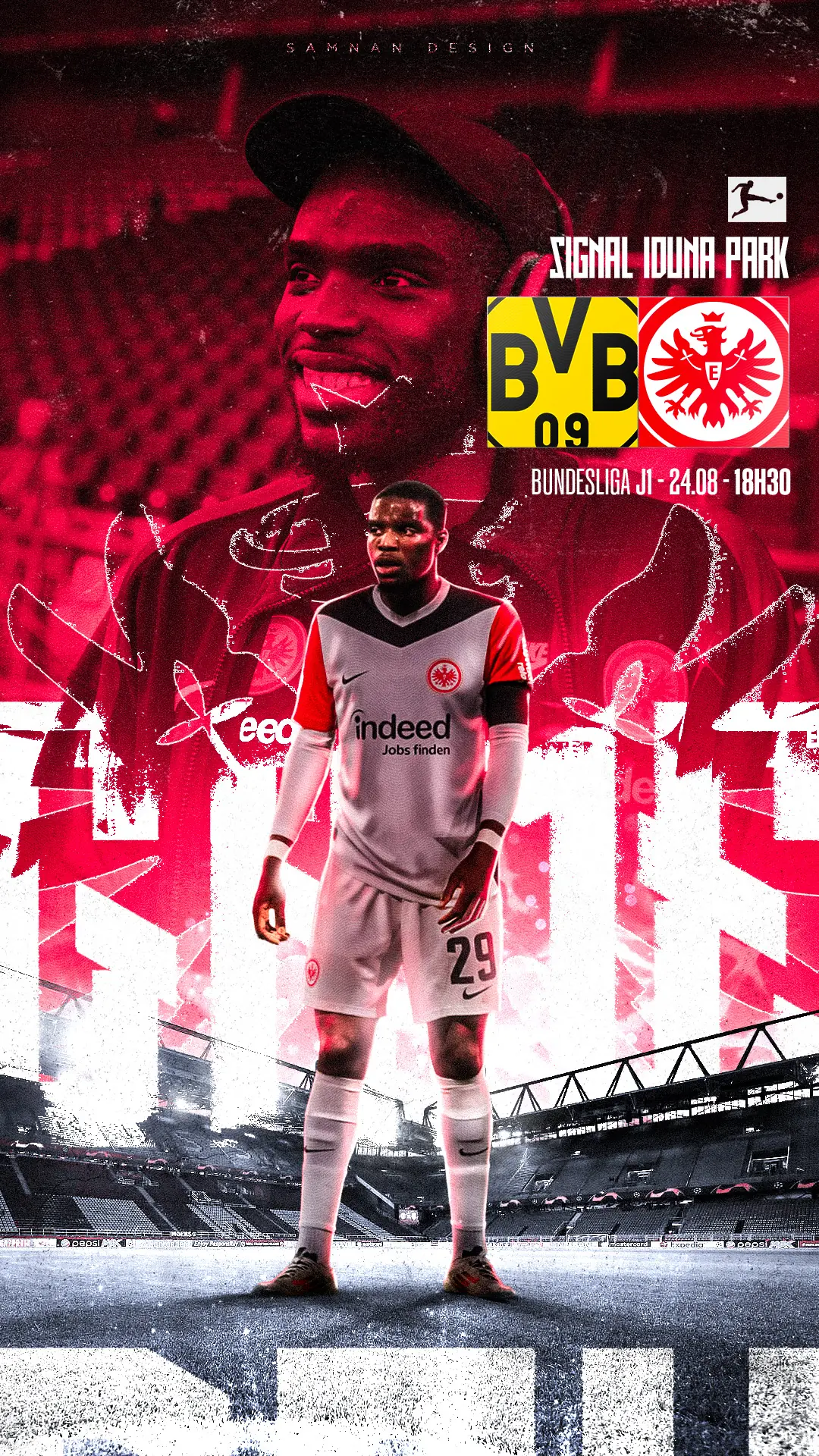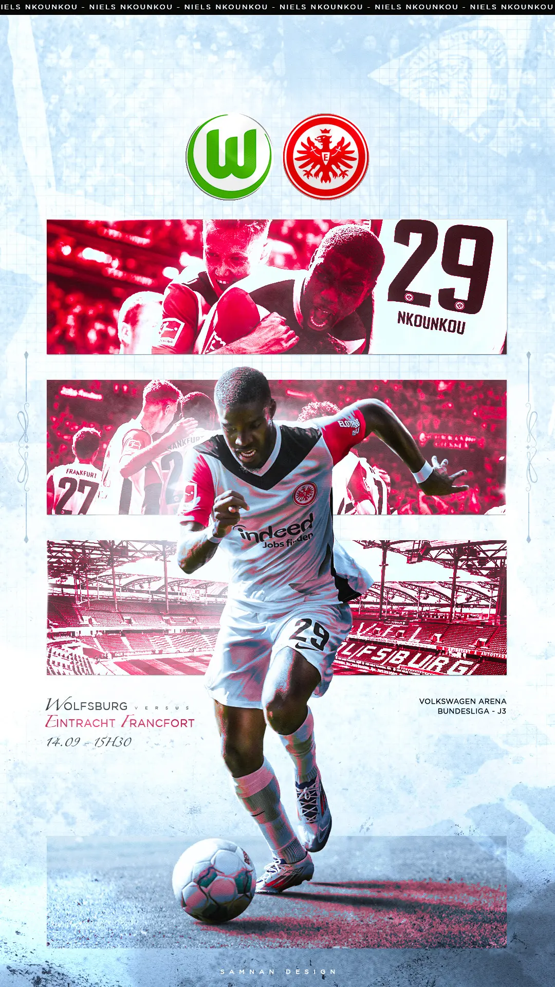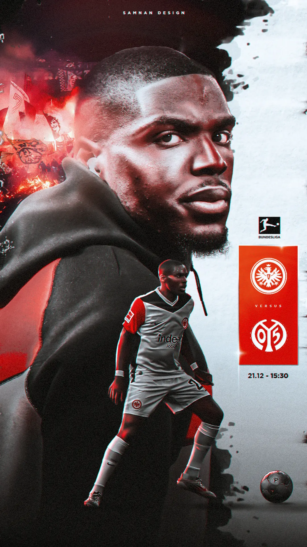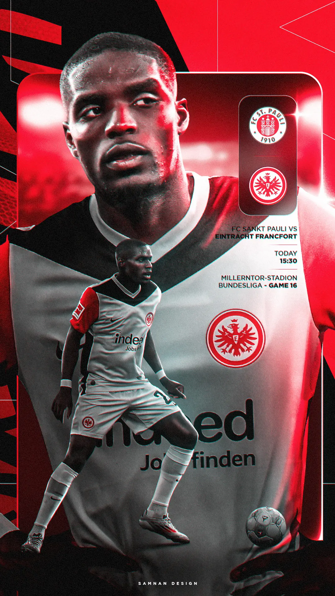 Niels Nkounkou est un joueur français qui évolue actuellement dans le club de l’Eintracht Francfort. L’Agence Double Contact m’a fait part de son envie et besoin d’avoir des visuels d’avant-match. Les visuels d’avant-match jouent un rôle clé dans la communication autour d’un match. Ils permettent d’informer les supporters sur les détails du match, de promouvoir la rencontre sur les réseaux sociaux et de mettre en valeur le joueur sur les réseaux sociaux. Ils permettent aussi de renforcer l’identité du joueur, créer de l’attente chez les fans, et donc génère des interactions et une proximité avec les fans.